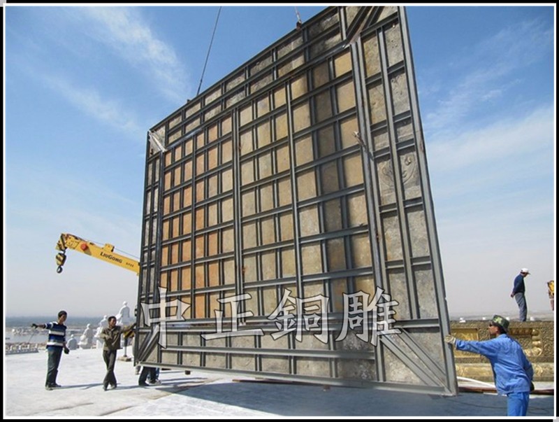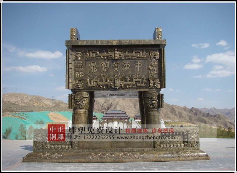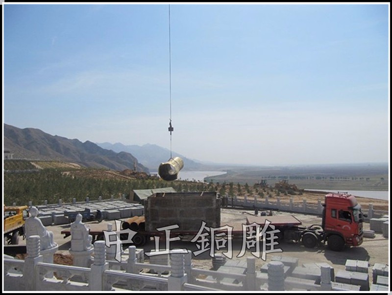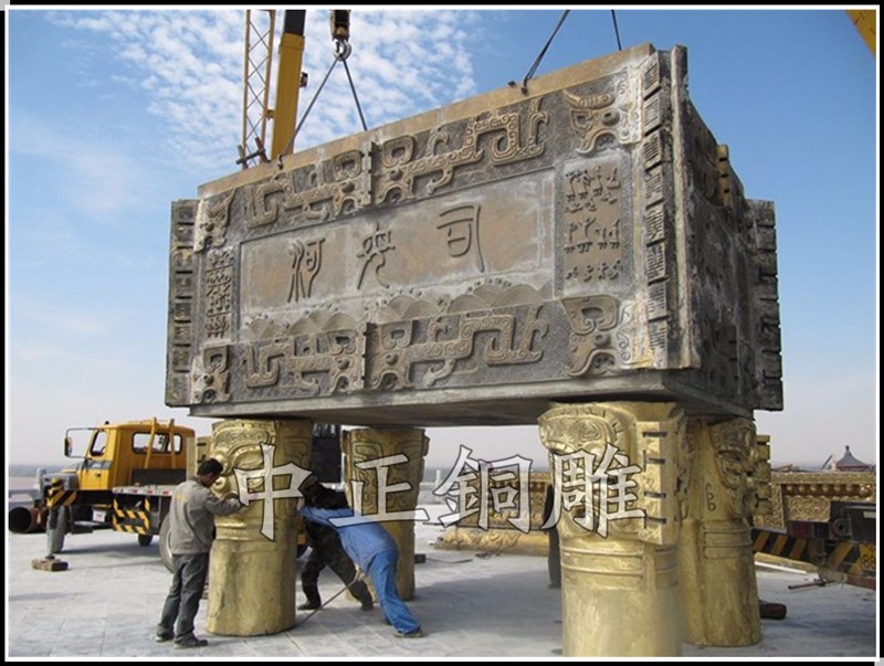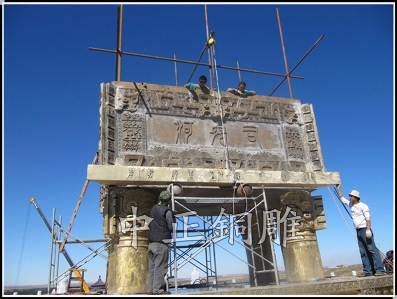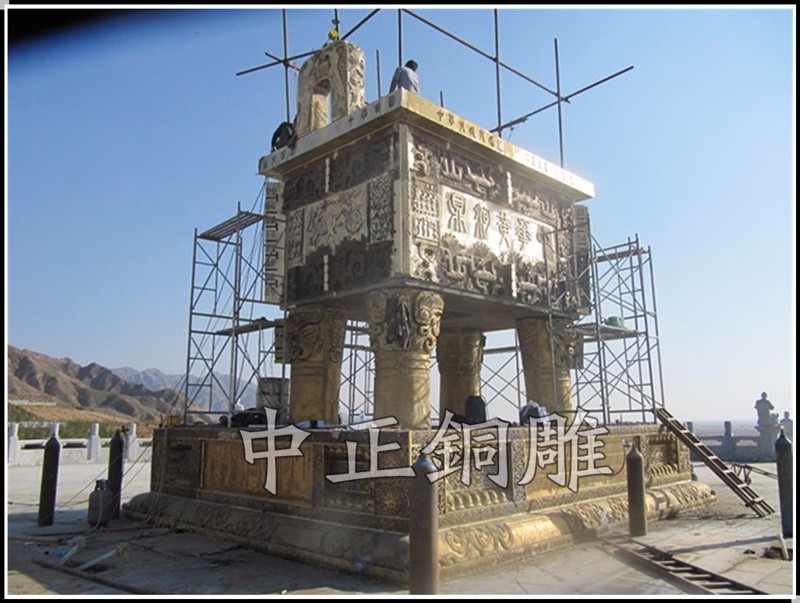 安裝于寧夏回族自治區(qū)青銅峽《中華黃河壇》景區(qū)的中華黃河鼎,銅鼎總高6.3米,采用黃銅澆鑄,分塊組裝焊接工藝,紋飾精雕細(xì)琢,大銅鼎氣勢(shì)恢宏,總重13800公斤,歷時(shí)5個(gè)月制作完工。